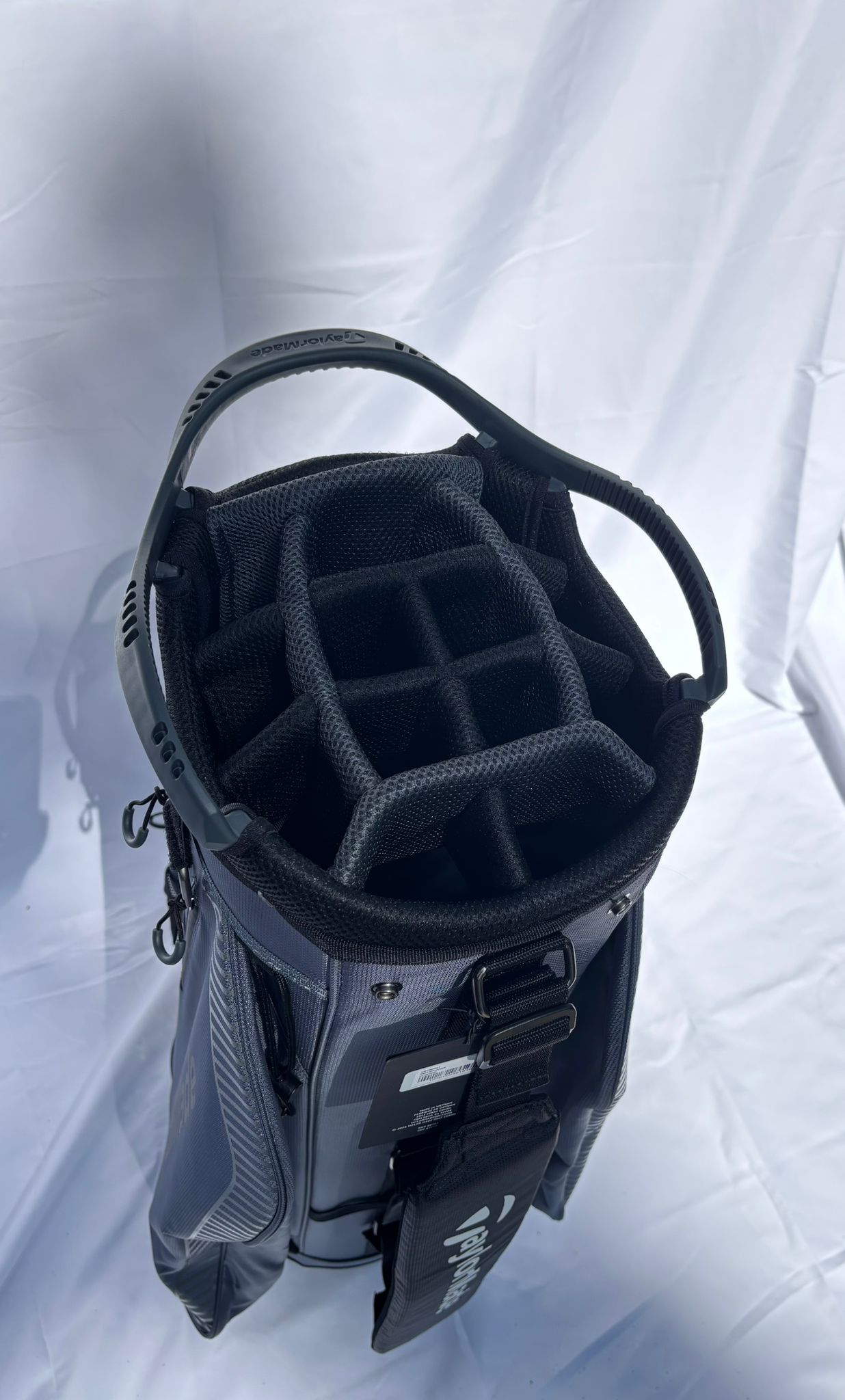 Dieses hochwertige Cartbag ist die ideale Goldtasche für ein „Schönes Spiel“. Sie hat ein Top mit 14 Schächten, 8 weitere Taschen für Wertgegenstände und allgemeinen Stauraum, einen Sockel um selbst zu stehen und eine 360* abnehmbare Reißverschlusstasche für Bälle.